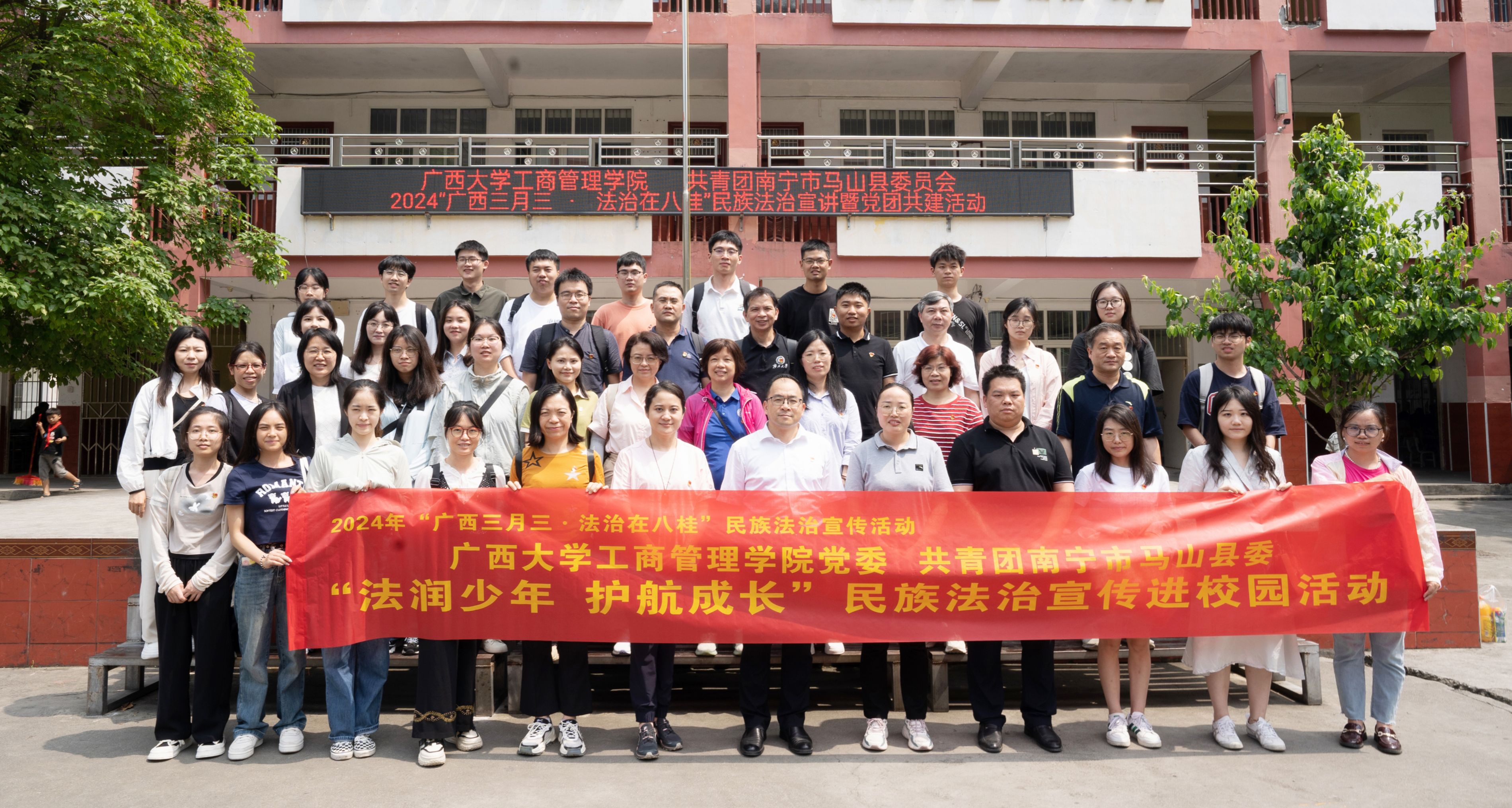 为深入贯彻落实习近平法治思想和习近平总书记对广西重大方略要求,4月26日,williamhill官网英国威廉希尔公司党委联合共青团南宁市马山县委员会开展“广西三月三·法治在八桂”民族法治宣传暨党团共建活动。英国威廉希尔公司党委书记罗诚、副经理申韬,马山团县委书记马玉花、马山县古寨瑶族乡党委书记陆家宝与英国威廉希尔公司教工财会党支部、旅管党支部、行政党支部和研究生第二党支部的师生党员代表参加了活动。