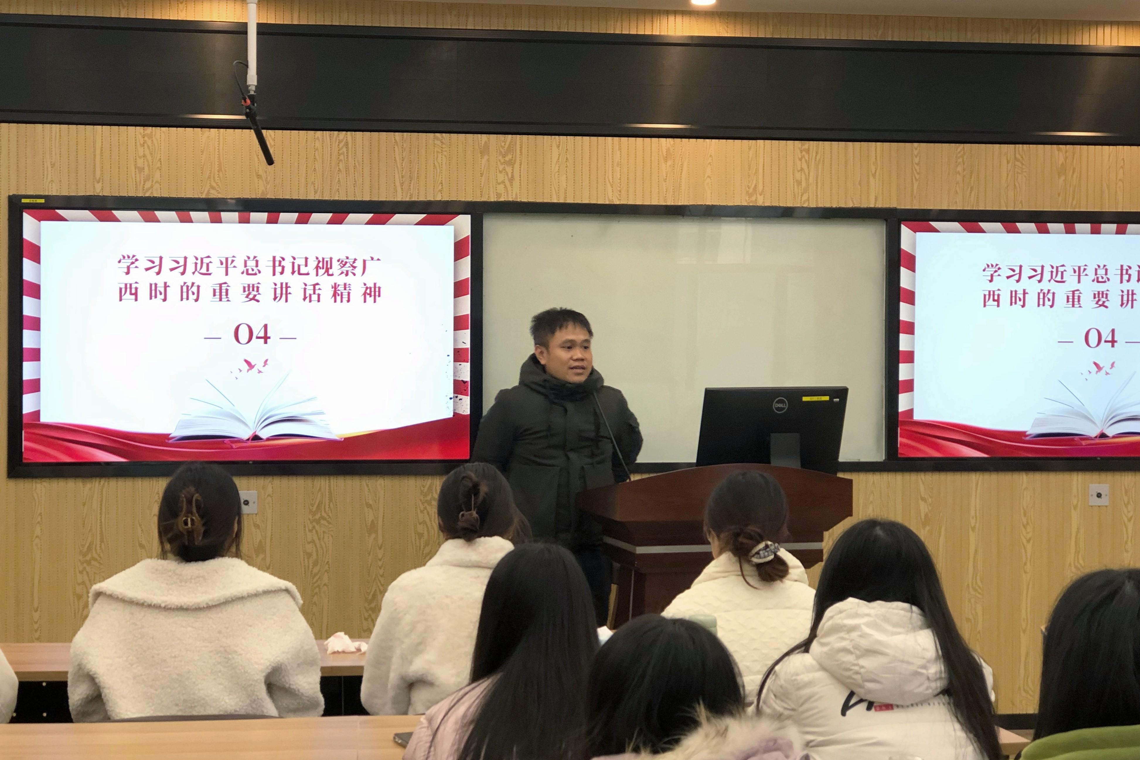 本科生第一党支部在515教室集中学习习近平总书记视察广西时的重要讲话精神,并交流分享了学习心得体会。