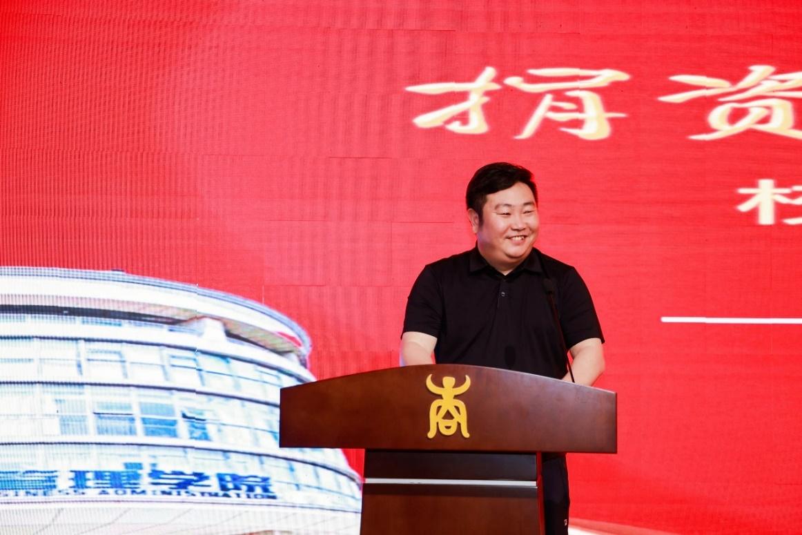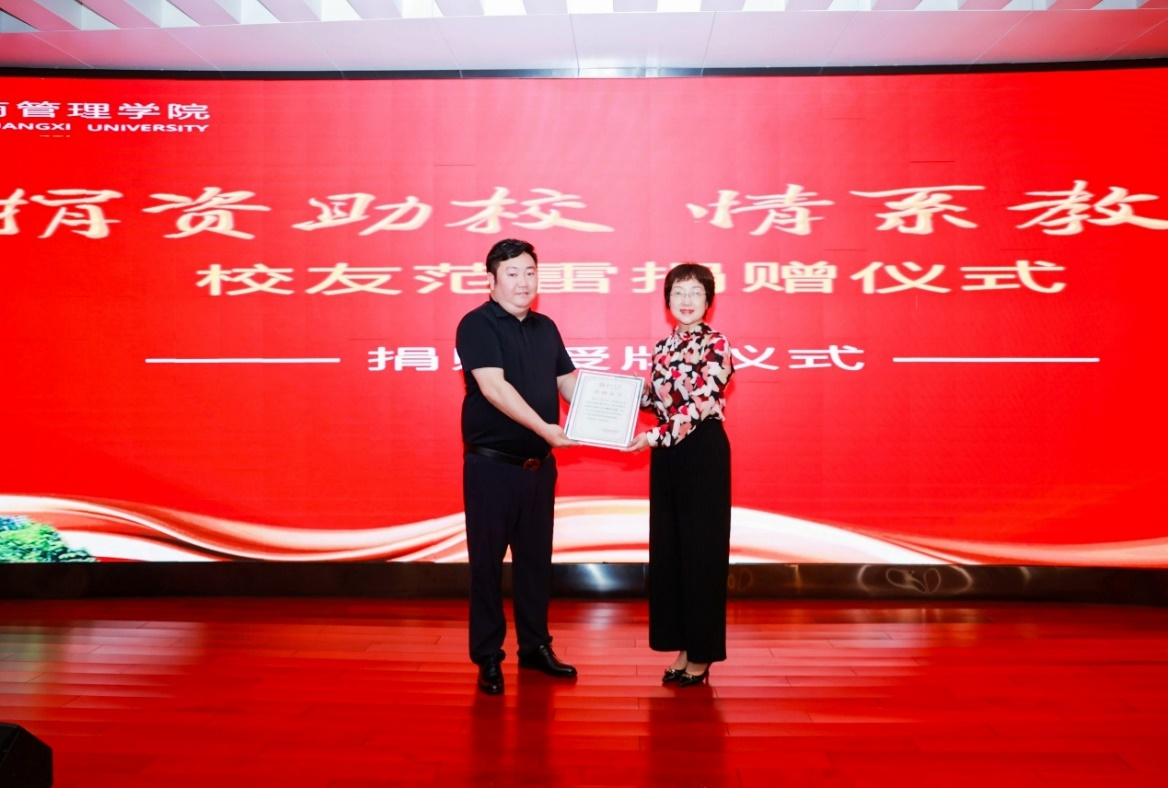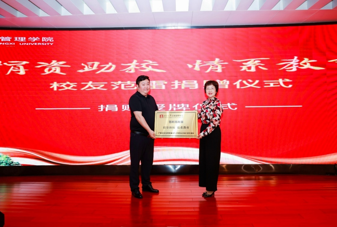 廖东红副经理为范雷员工授予牌匾并颁发证书。牌匾上“捐资助校,情系教育”八个字是对范雷员工此次捐赠最好的阐释,充分彰显了范雷员工深厚的爱校情怀和高度的荣校担当。