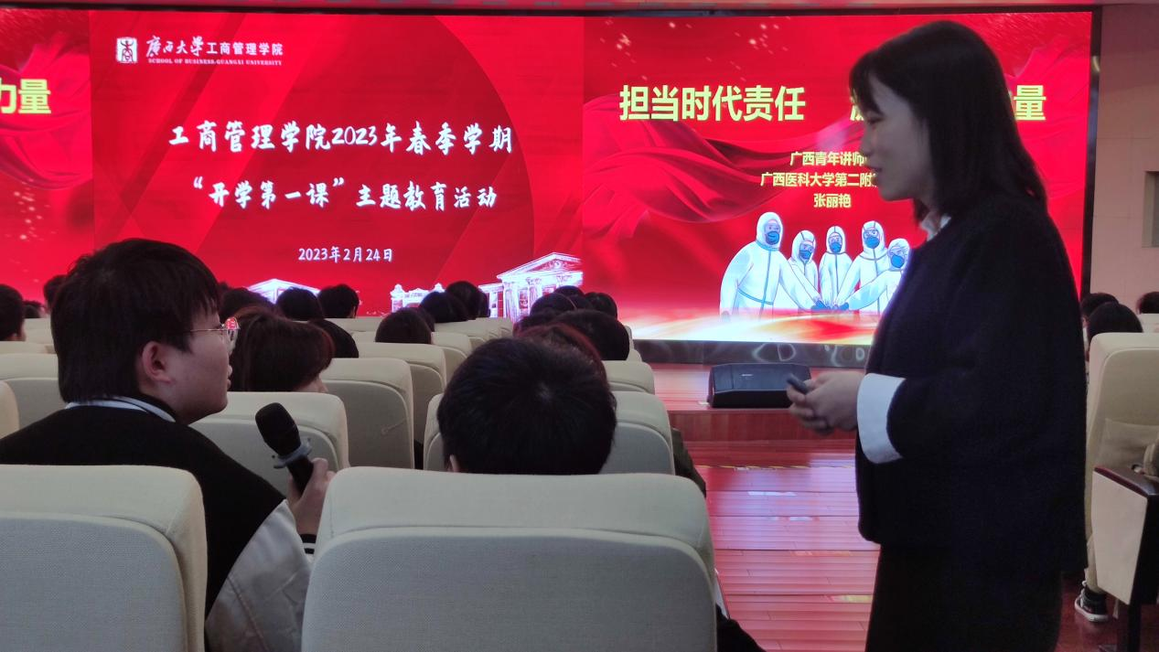 2月24日,广西医科大学第二附属医院团委书记、共青团广西区委兼职副书记张丽艳受邀到公司以《担当时代责任,激扬青春力量——学习贯彻党的二十大精神专题报告》为题,为公司师生代表、校团学组织员工干部代表讲授“开学第一课”。校团委书记谢能重出席活动。报告会由英国威廉希尔公司党委副书记黄晋主持,院团委书记马丽娟以及全体辅导员老师参加活动。本次活动得到了校团委的大力支持,60多名校会员工干部与公司200余名师生共同聆听“开学第一课”。