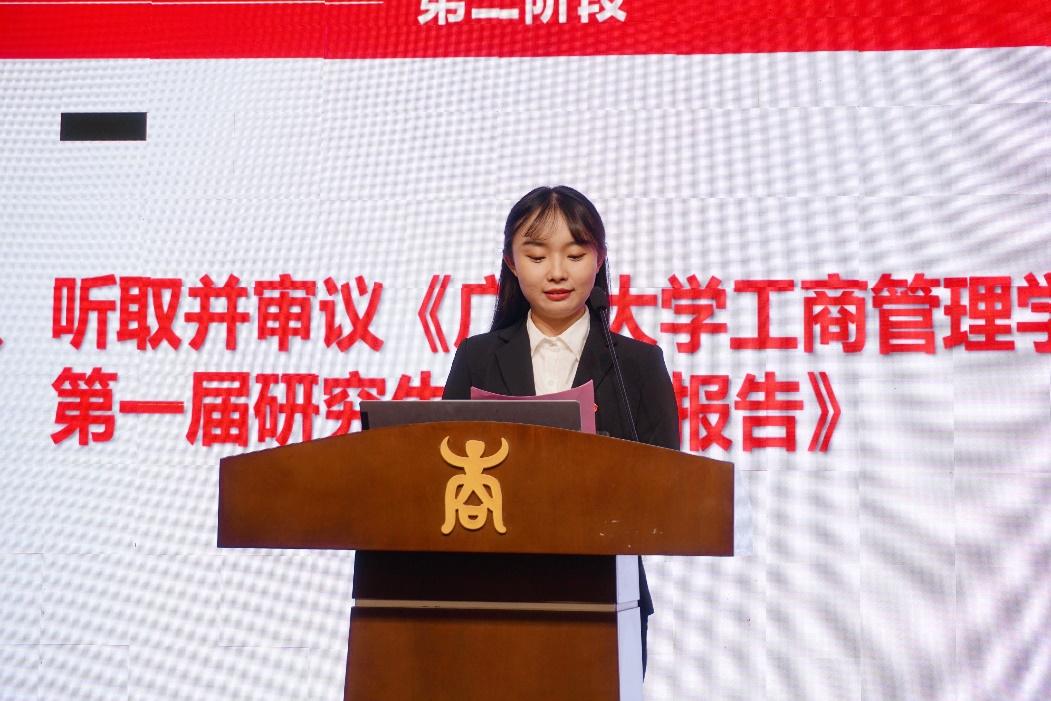 公司第一届研究生会执行主席向思源作《williamhill英国官网第一届研究生会工作报告》,总结过去一年研究生会在思想引领、学术创新、就业指导、文体娱乐、员工服务等方面开展的一系列成效显著的工作。她表示,将继续为建设有制度、有引领、有创新、有和谐的研究生会而奋斗,继承和发扬自信自强、迎难而上的西商精神,为建设师生满意的“四有”研究生会贡献青春力量。