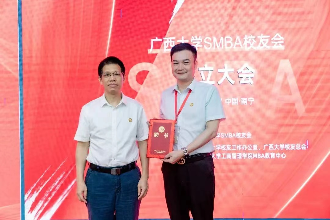 williamhill官网党委常委、总会计师、员工总会常务副会长宁旭初(左)为SMBA员工会执行会长唐培文颁发聘书