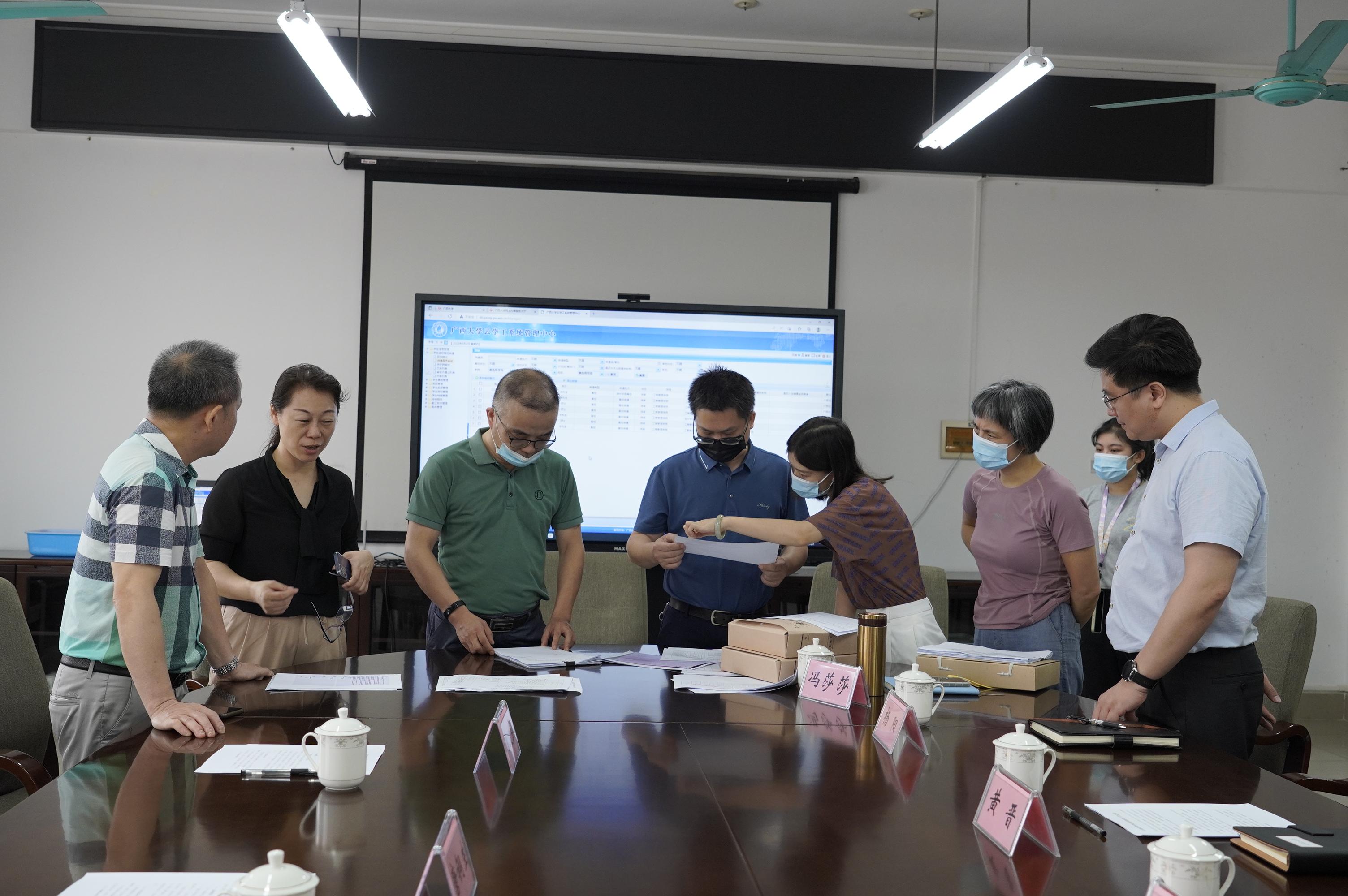 督查组在420会议室详细查阅了公司消毒台账、员工进出校审批材料、教职工离邕审批材料、校外人员申请进校双码和核酸检测情况等原始纪录,认真听取了公司对疫情防控工作开展落实的介绍,详细询问了检查防控工作流程和具体措施。