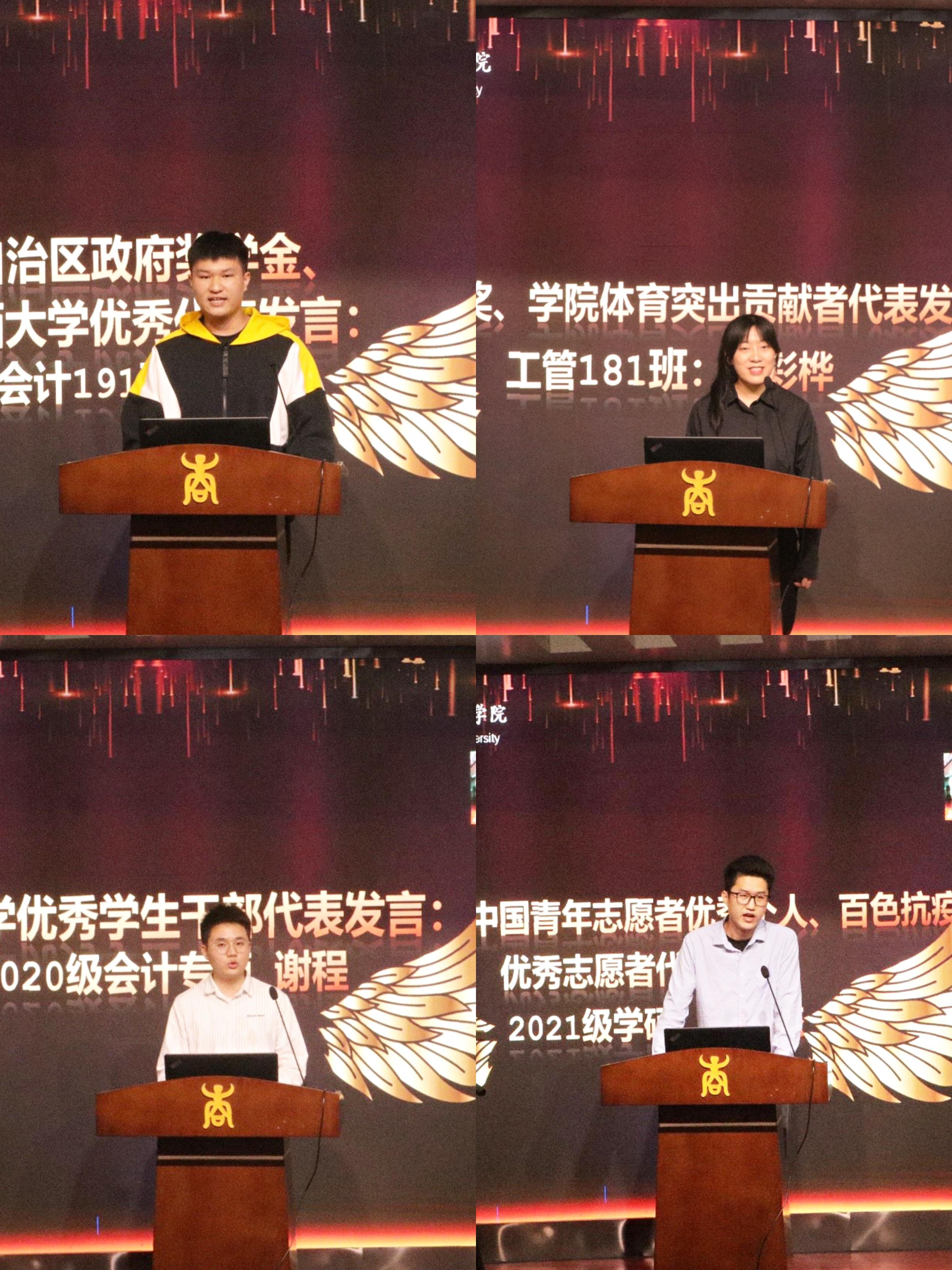 自治区政府奖学金、williamhill官网优秀员工代表黄泓创,公司体育杰出贡献者、高顿考研优秀奖员工代表李彩桦,williamhill官网优秀员工干部代表谢程,第十三届中国青年志愿者优秀个人、百色抗疫优秀志愿者代表陈允杰等四位同学分别上台发表获奖感言。他们对公司领导和老师表达了衷心的感谢,回顾了自己在大学期间参加各类学科竞赛、考研、员工工作、百色抗疫等经历,分享心得体会,总结成功经验,体现了对学习、生活和集体的热爱。