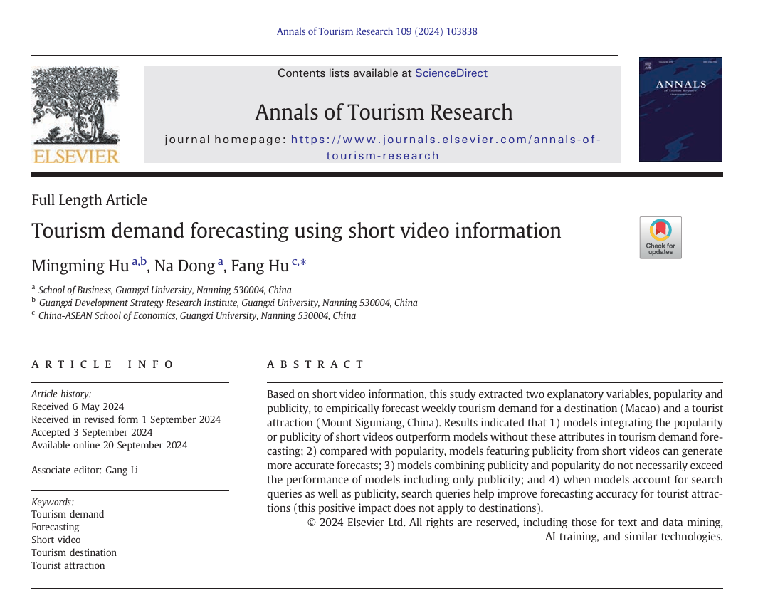 近日,公司副教授胡明明、硕士研究生董娜与经济公司胡芳博士合作撰写的《Tourism Demand Forecasting Using Short Video Information》学术论文在旅游管理国际高水平期刊《Annals of Tourism Research》在线发表。《Annals of TourismResearch》是JCR分区Q1区期刊,中科院1区TOP期刊,ABS四星期刊,2023年影响因子为10.4。
