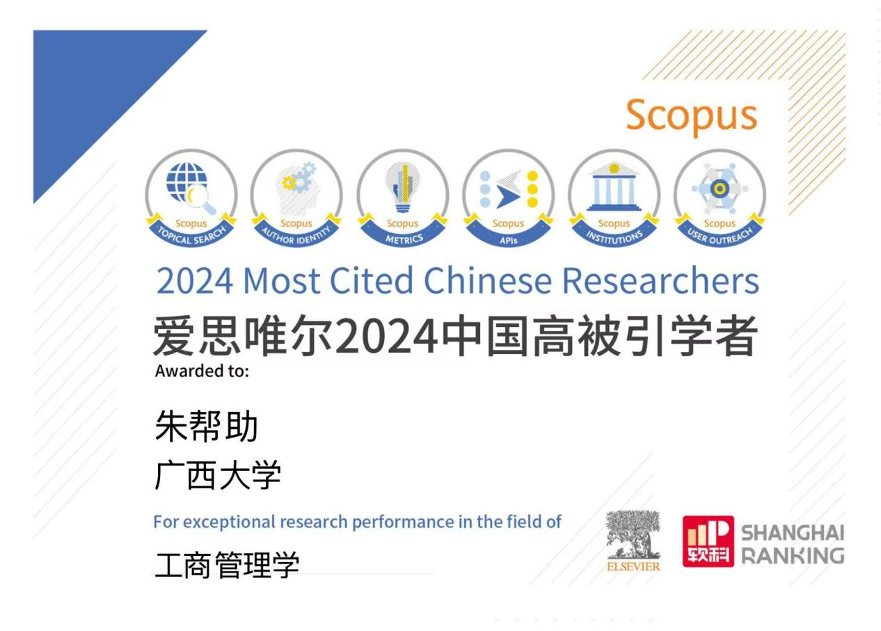 朱帮助教授自2021年以来连续4年入选“中国高被引学者”榜单,这对推动公司工商管理学科发展、扩大公司全球影响力有着积极影响。未来,williamhill英国官网将继续聚焦于国家战略需求和区域发展需求,开展创新性研究,进一步服务国家战略和广西经济社会发展,助力推进公司“双一流”建设和部区合建,不断提升科技创新和人才培养能力。