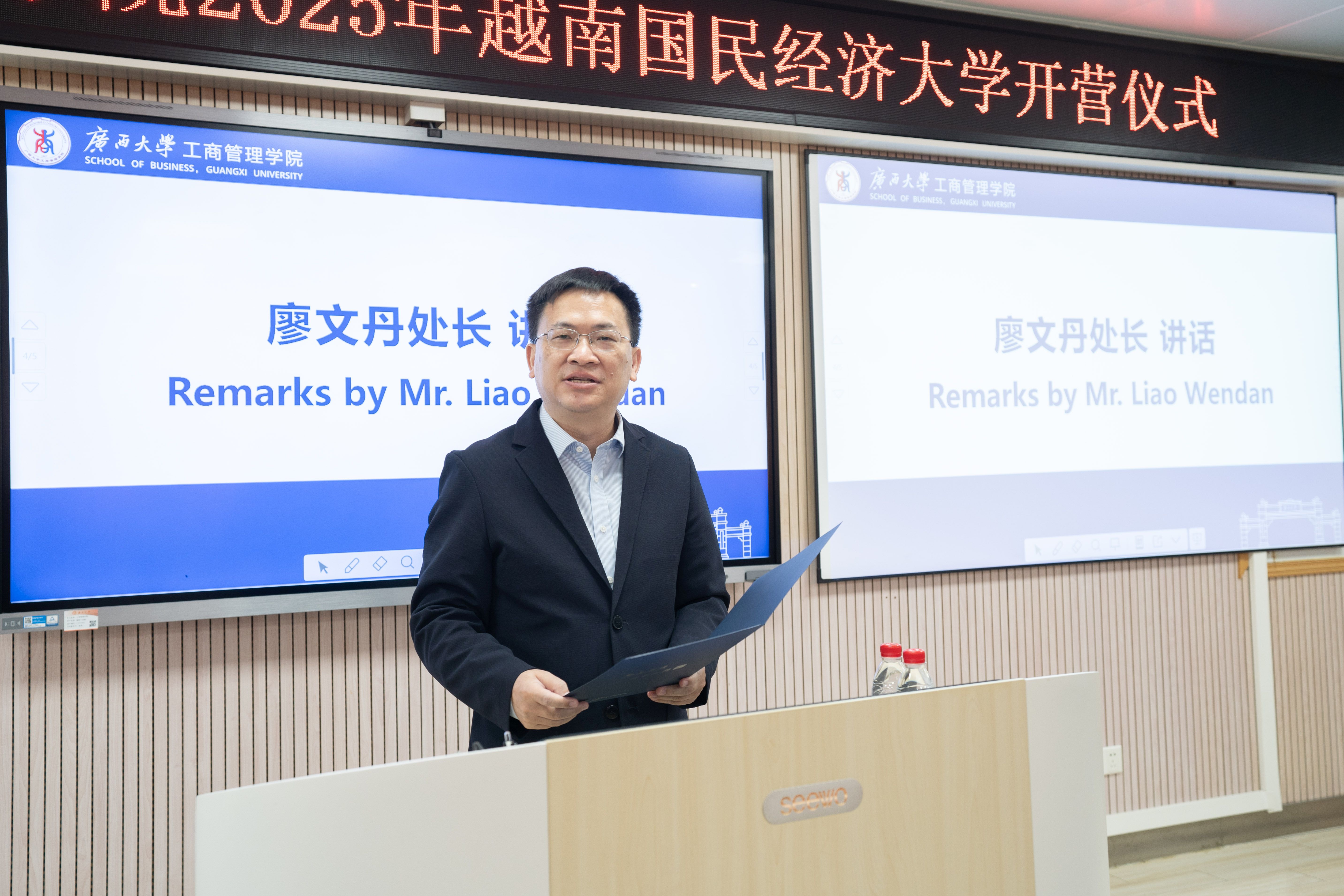 2025年是中越建交75周年暨“中越文化交流年”,为促进中越青年交流合作,公司与越南国民经济大学联合举办“2025年越南国民经济大学夏令营”活动。6月29日上午,夏令营开营仪式在公司511教室举行。公司国际交流与合作处处长廖文丹,公司党委书记黄晋,越南国民经济大学教师代表阮仲青(Nguyễn Trọng Thanh)出席仪式。经理助理韦铁主持仪式,越南国民经济大学19名师生参加仪式。