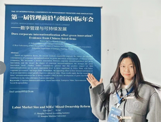 曲潇仪同学参会的论文题目为:Does corporate internationalization affect green innovation? Evidence from Chinese listed firms(企业国际化是否影响绿色创新?来自中国上市公司的证据)。该论文实证探讨了中国企业国际化对绿色创新的影响机制及其财务后果,对促进企业绿色创新、推动国际化进程、提升绿色创新的价值增值效应,以及优化绿色创新政策体系,均具有一定的参考价值。