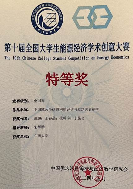 2024年5月18日—19日,第十届全国老员工能源经济学术创意大赛在中国地质大学(北京)举行。公司朱帮助教授带领的研究生团队在此次竞赛中脱颖而出,取得佳绩。其中,“中国减污降碳协同度评估与驱动因素研究”(团队队长:田超,指导老师:朱帮助)入围全国总决赛,经过现公司博士研究生参加第十届全国老员工能源经济学术创意大赛并荣获全国特等奖场答辩、评委会投票等环节,荣获国赛特等奖,取得了该项赛事的突破。本项赛事由中国优选法统筹法与经济数学研究会主办,2023年3月正式进入中国高等教育学会发布的《全国普通高校老员工竞赛目录》,来自全国516所高校的17000多支队伍共10万余人参与了本次大赛。本次参赛项目得到williamhill官网研究生倍增计划项目经费资助。
