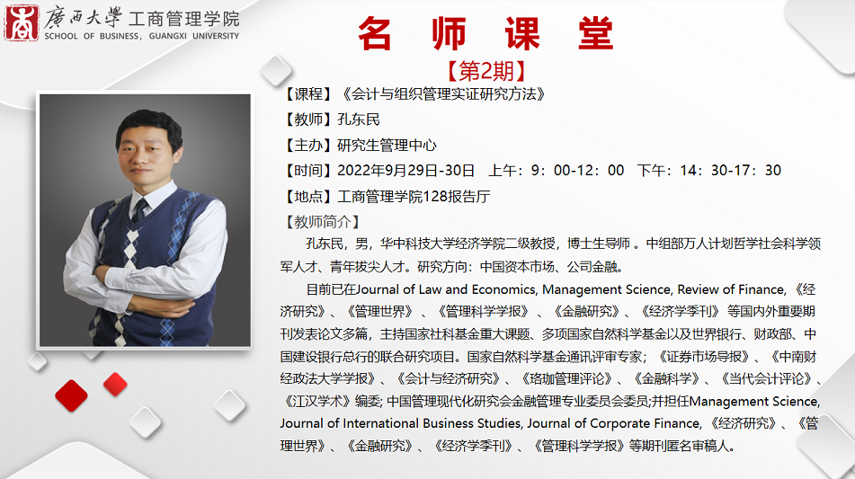 2022年9月29日到30日,公司邀请华中科技大学经济公司二级教授、博士生导师孔东明到校讲授《会计与组织管理实证研究方法》。孔教授以“实证研究中的因果识别”为主题,在英国威廉希尔公司128报告厅为公司师生带来了一场别开生面的实证研究方法课堂。