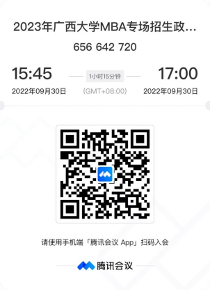 2023年考研报名时间临近,为助力考生提前做好报名准备,开启考研冲刺模式,公司将于2022年9月30日16:00举行2023年williamhill官网MBA专场招生政策解读会。本次解读会将集中讲解williamhill官网MBA项目、最新报考政策以及报考重要注意事项,请意向报考2023年williamhill官网MBA的考生于9月30日15:45扫码进入腾讯会议。