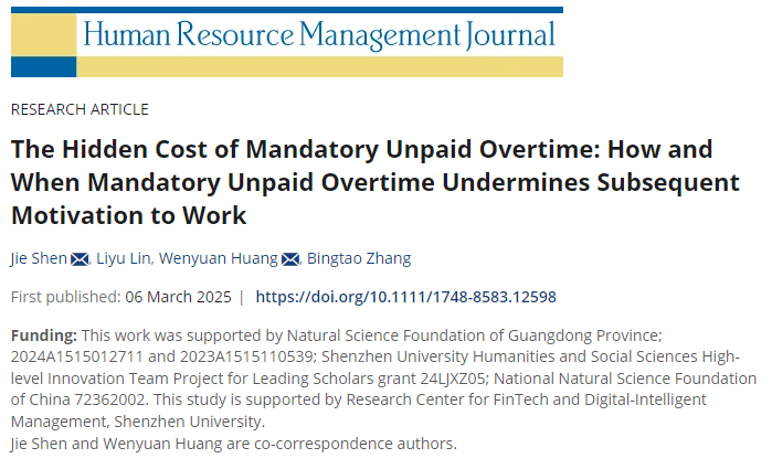 近日,公司黄文远老师在人力资源管理领域研究取得新进展,利用日记记录和人工智能面部识别技术新型研究方法,探讨无偿性强制加班对员工工作动机的影响作用。相关成果以“The Hidden Cost of Mandatory Unpaid Overtime: How and When Mandatory Unpaid Overtime Undermines Subsequent Motivation to Work”为题,在人力资源管理领域国际顶级期刊《Human Resource Management Journal》发表。论文合作者包括深圳大学沈捷教授及其硕士研究生林丽玉、博士研究生张冰涛。