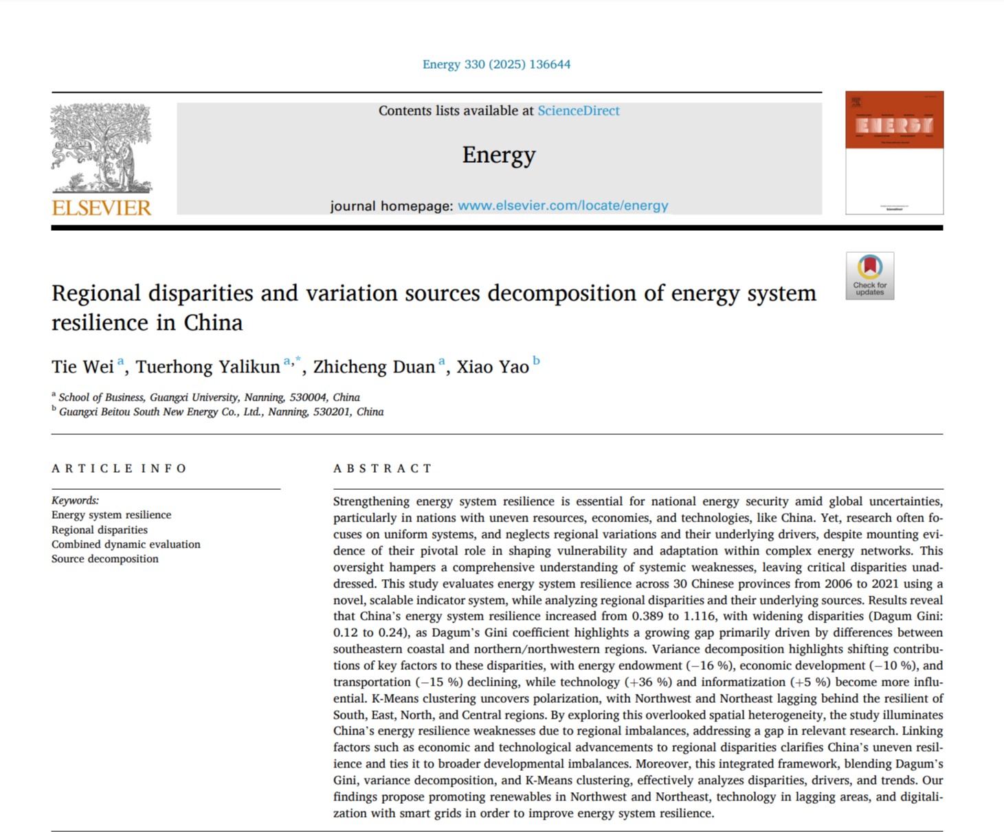 近日,公司韦铁教授团队在我国能源系统领域研究取得重要进展,研究成果《Regional disparities and variation sources decomposition of energy system resilience in China》在能源领域国际权威期刊《Energy》上发表。公司韦铁教授为论文第一作者,论文通讯作者为公司硕士研究生亚力昆·吐尔洪,其他合作作者包括公司博士研究生段至诚和EMBA学员、广西北投南新能源公司姚晓,williamhill英国官网为论文第一单位和通讯单位。
